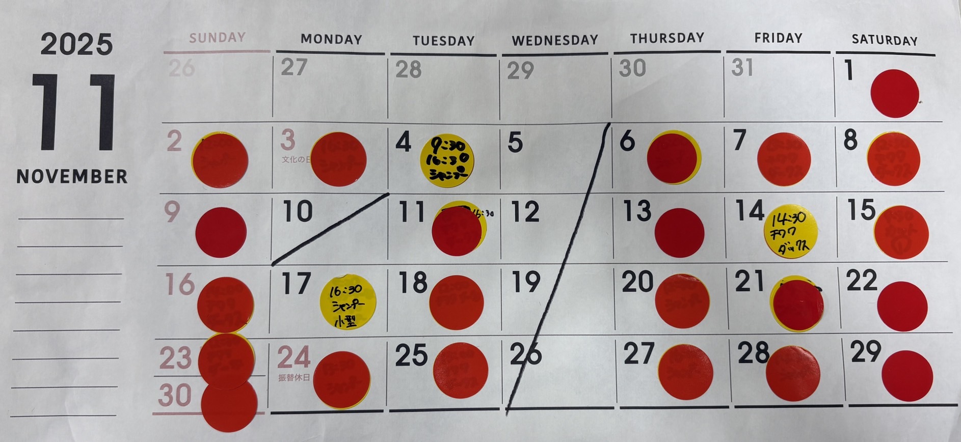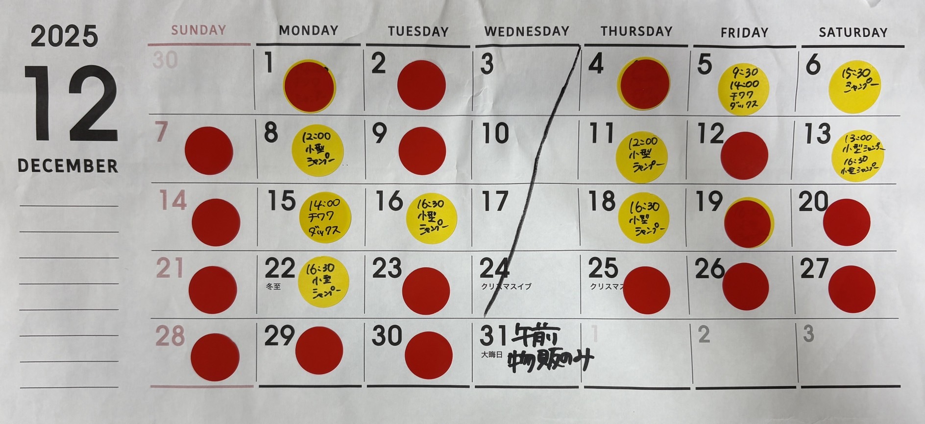 2025.10.16 予約状況のご案内(2025年10月15日現在)毎週木曜更新予定 予約状況 ★現在、2025年12月までトリミングのご予約受け付けております。 (2025年11月1日(土)より、2026年1月分のご予約開始) 赤→空きございません 黄→残りわずか 空白→空きがございます 11月10日(月)はお休みです。